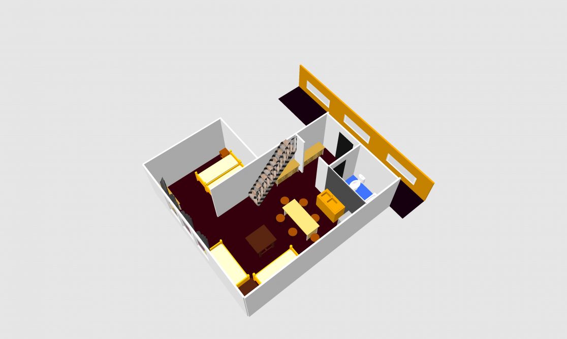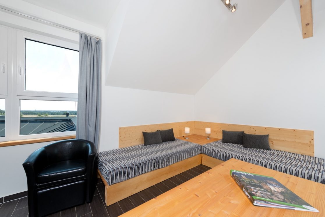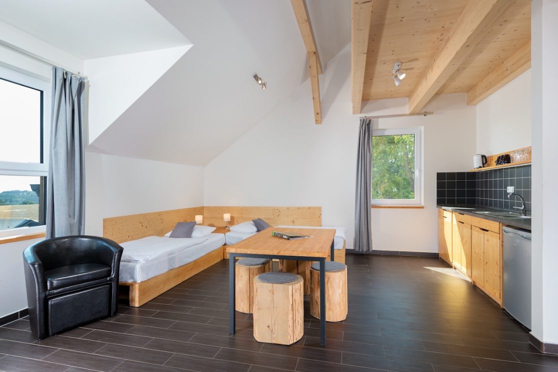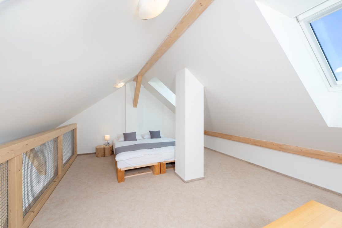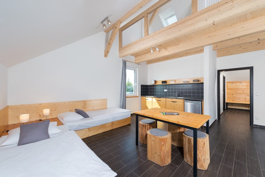 Apartmán pro 6 osob v prvním patře má 53 m2. Kromě hlavní místnostimá i samostatně oddělenou ložnici se 2 lůžky a dále mezonet – galerii, kde jsou 2 lůžka.