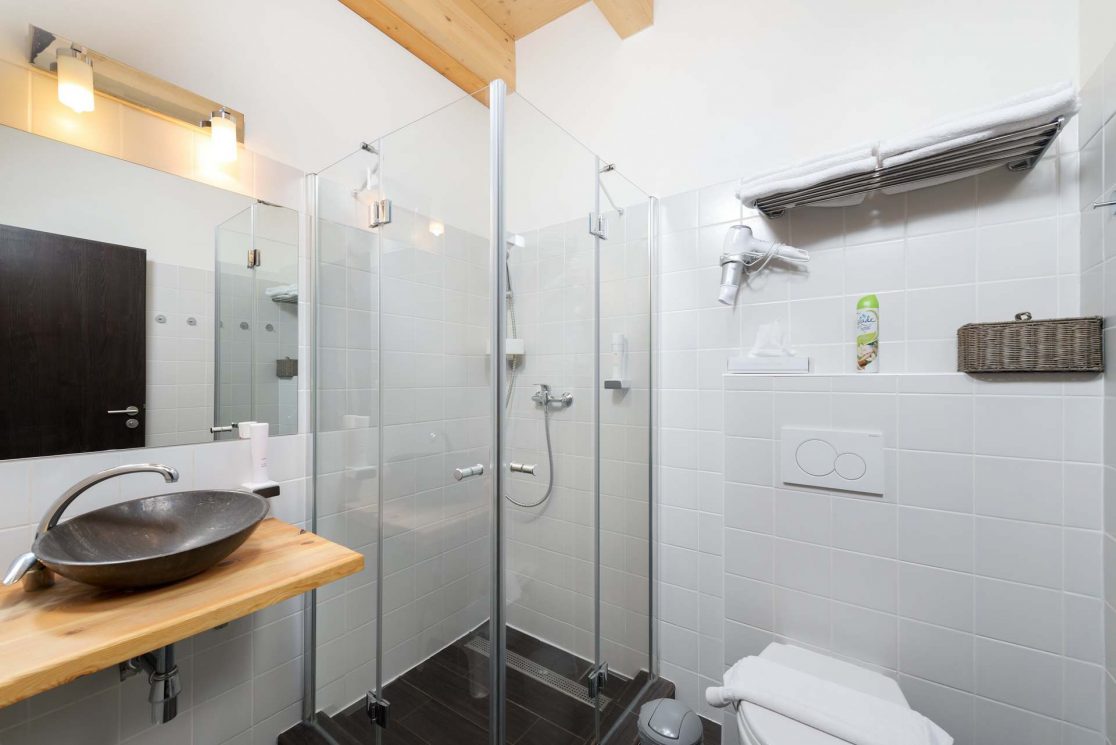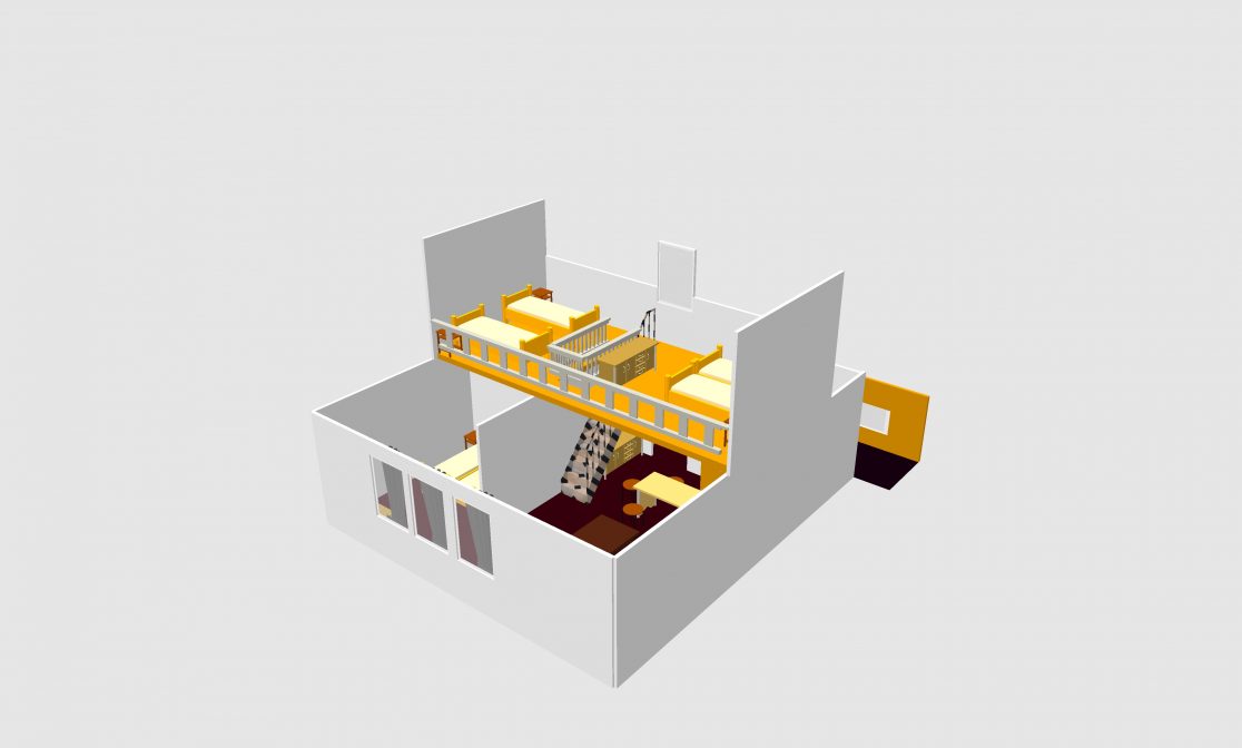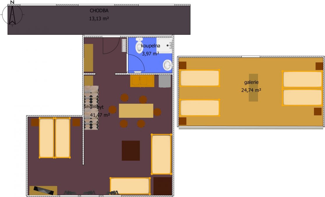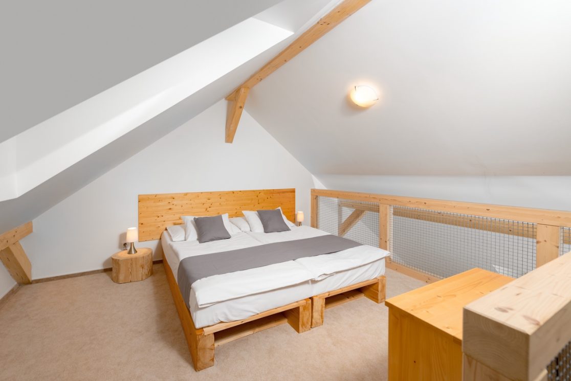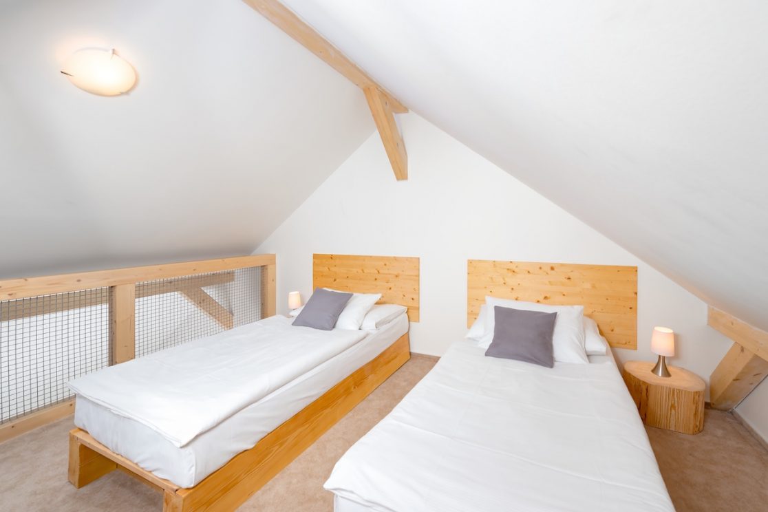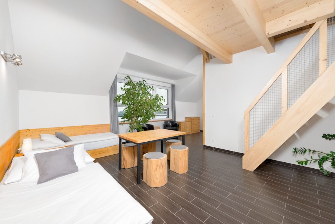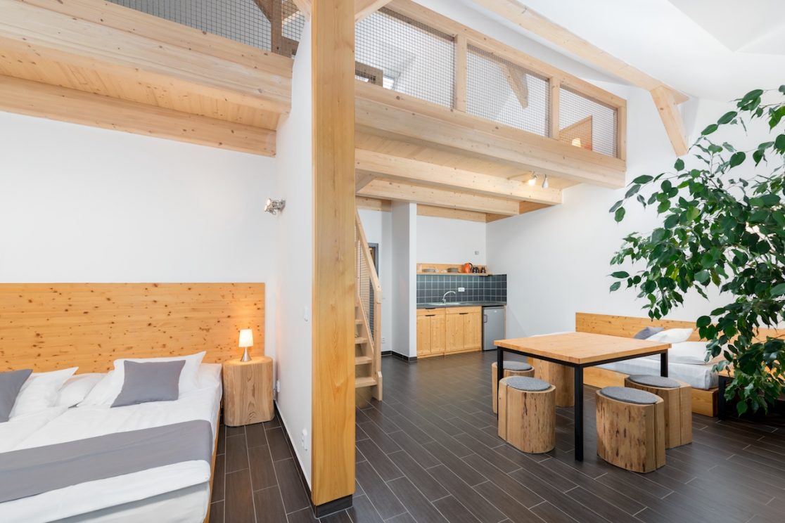 Apartmán pro 8 osob v prvním patře má 68 m2. Kromě hlavní místnosti má i mezonet – galerii, kde jsou 4 lůžka.