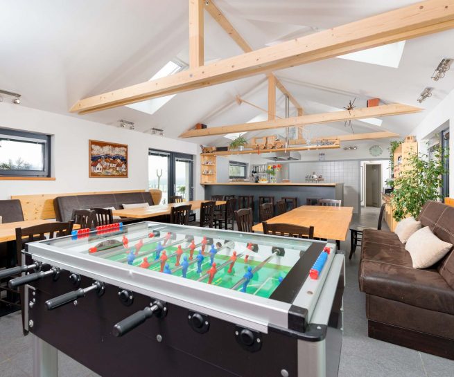 Areál je dispozičně rozdělen na 3 části. Apartmánová část nabízí 5 bytů (apartmánů) ve dvou patrech (8 lůžkový, 6 lůžkový se samostatnou ložnicí, dva krát 4 lůžkový a jednou 3 lůžkový). Zázemí pro ubytované tvoří společenská místnost s otevřenou kuchyní a krbovými kamny. Venkovní část je rozlehlý prostor, bezpečný pro děti, ohniště s posezením, sauna, terasy, hřiště, dětská trampolína, v dálce ohrady se zvířaty.