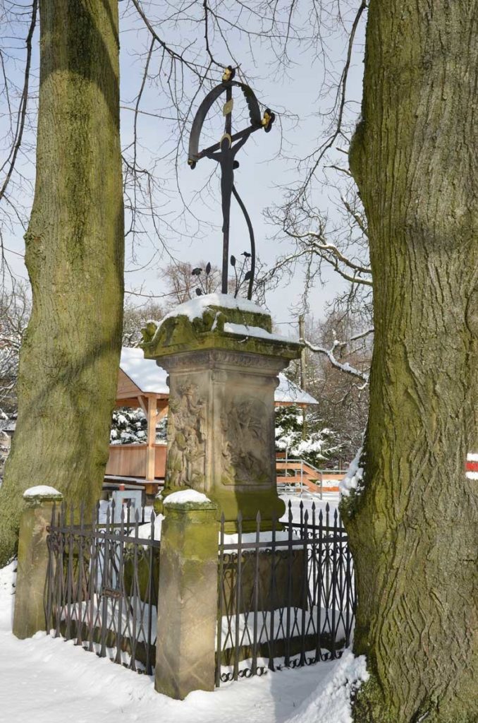 Tato Boží muka připomínají tragickou událost. Představují památku na jedinou dceru Josefa Šulce z čp. 15, která se utopila. Na přední straně je citace z evangelia sv. Matouše a kříž byl vystavěn v roce 1834. Ve vrcholu na kříži byl ztvárněn ukřižovaný Ježíš Kristus formou malby na plechu. Pravděpodobně je dílem Jana Zemana ze Žernova. Byl posvěcen o rok později 7. dubna českodubským děkanem Janem Pažoutem a dnes tomu je tedy přesně 180 let.